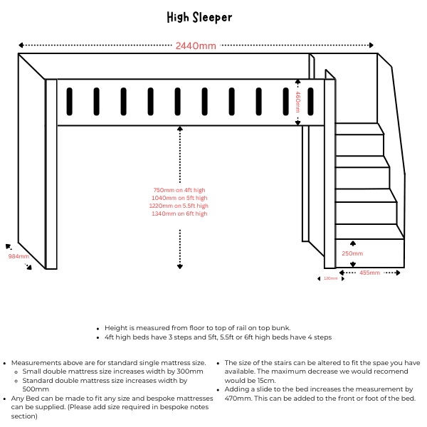 • We Can Make Adjustments To The High Sleeper To Fit The Space You Have Available. The Size Of The Stairs Or The Size Of The Mattress Can Be Altered (However This May Require A Bespoke Mattress) For Any Bespoke Requests Please Contact Us Via Facebook Or Email To Discuss.