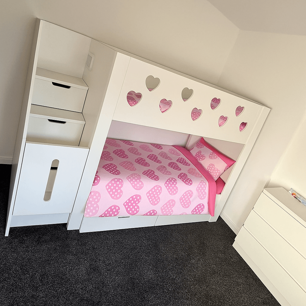 Brighten up your child’s bedroom with the Love Hearts Childrens Duvet Set, a charming and playful bedding set designed to bring warmth, comfort, and a touch of love to every bedtime. Featuring a delightful pattern of pink and white polka-dot hearts on a soft blush background, this duvet cover set adds a cheerful pop of color to any room. Perfect for girls’ bedrooms, this design pairs beautifully with our Funky Bunk Beds and kids’ bedroom furniture collections to create a stylish, coordinated look.