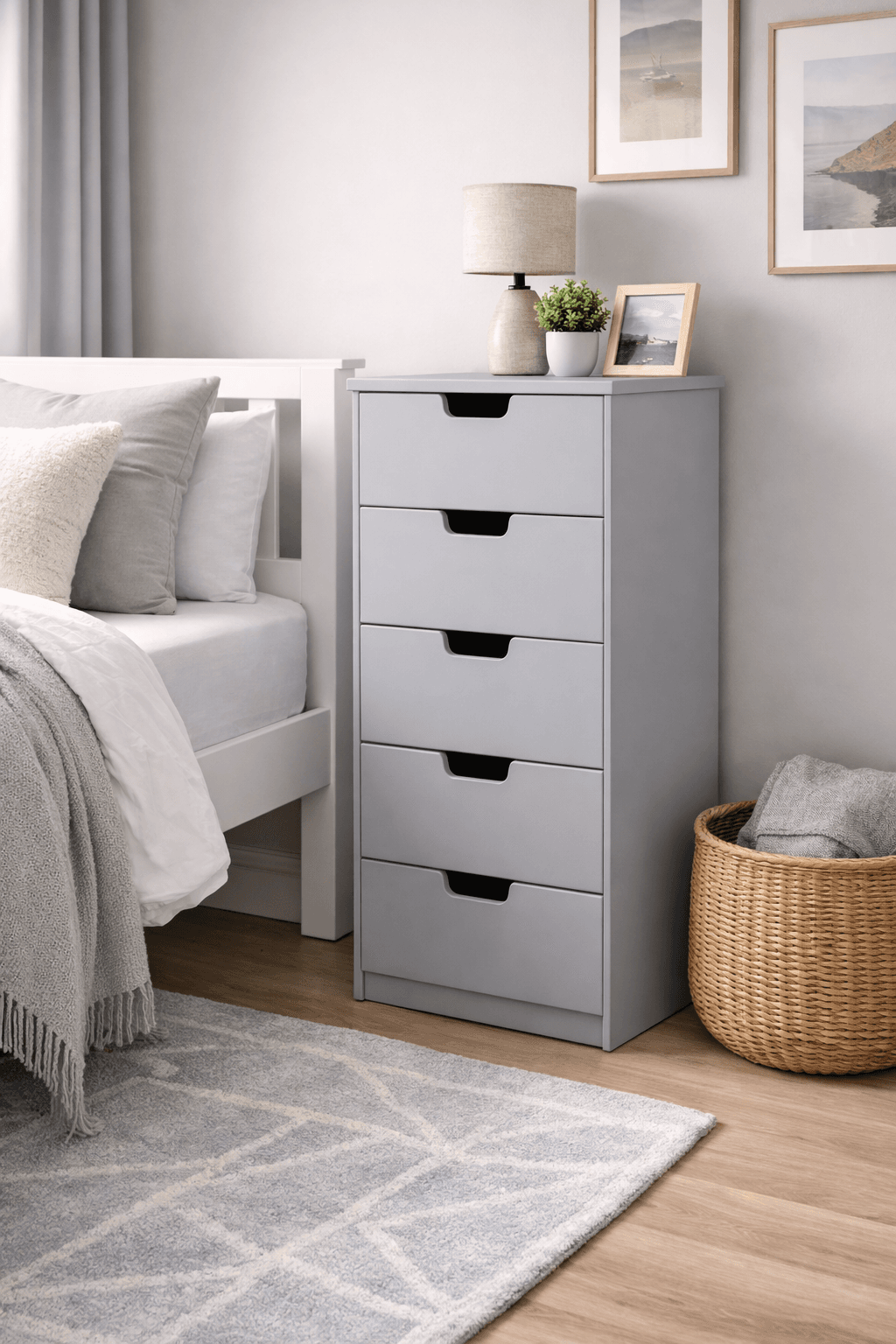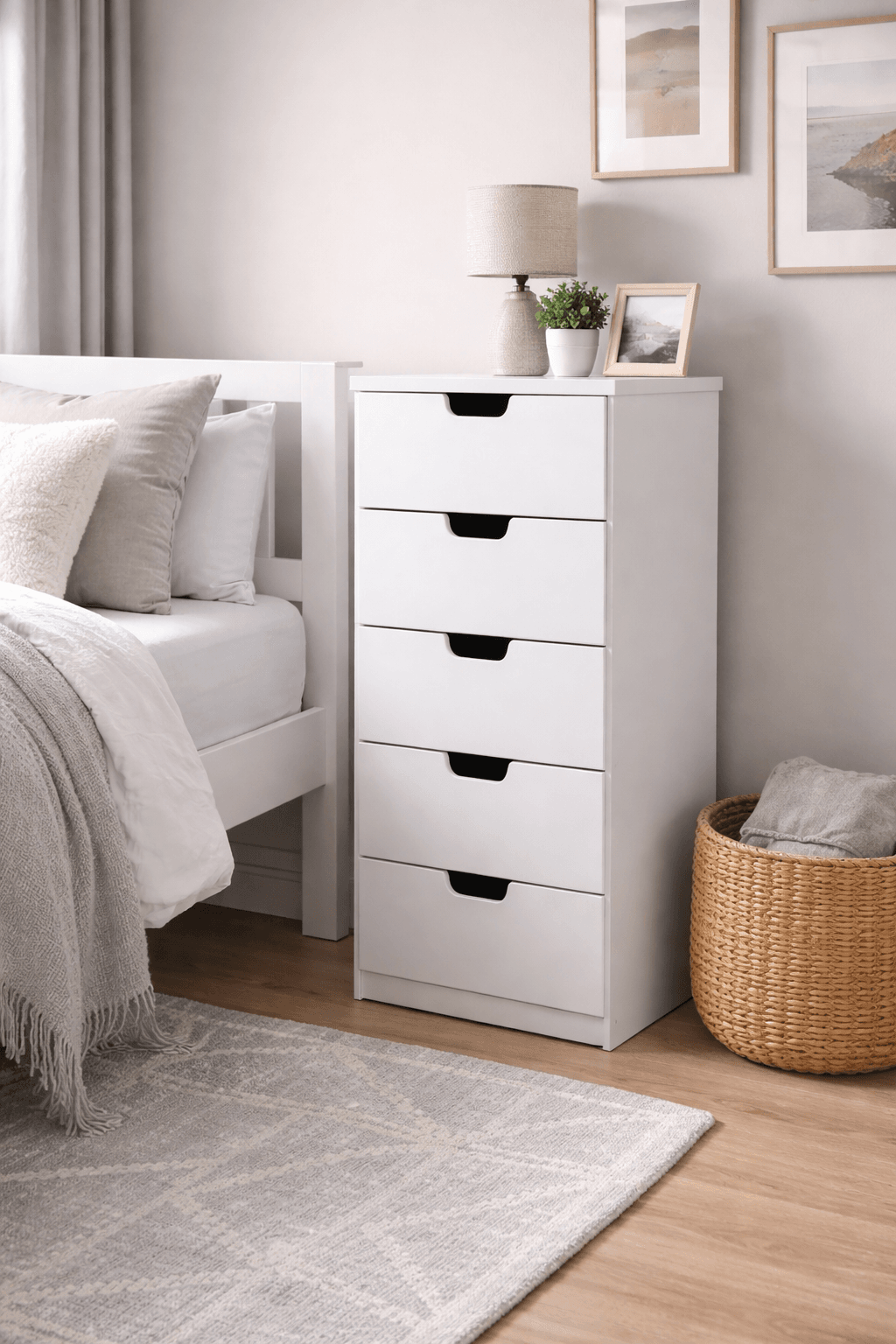 The five spacious drawers provide plenty of room for storing clothing, toys, bedding, accessories and everyday essentials. The tall design makes it ideal for maximising storage in smaller bedrooms while keeping everything neatly organised and easy to access.