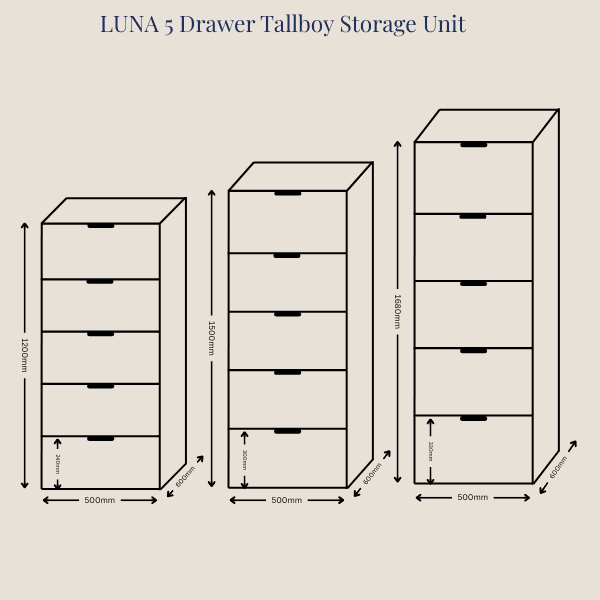 The LUNA 5 Drawer Tallboy Storage Unit is a sleek and practical storage solution designed to keep bedrooms organised while maintaining a clean, modern look. With its slim vertical design, this tall drawer unit provides generous storage without taking up too much floor space, making it perfect for children’s bedrooms, teenagers’ rooms, guest bedrooms or compact spaces.