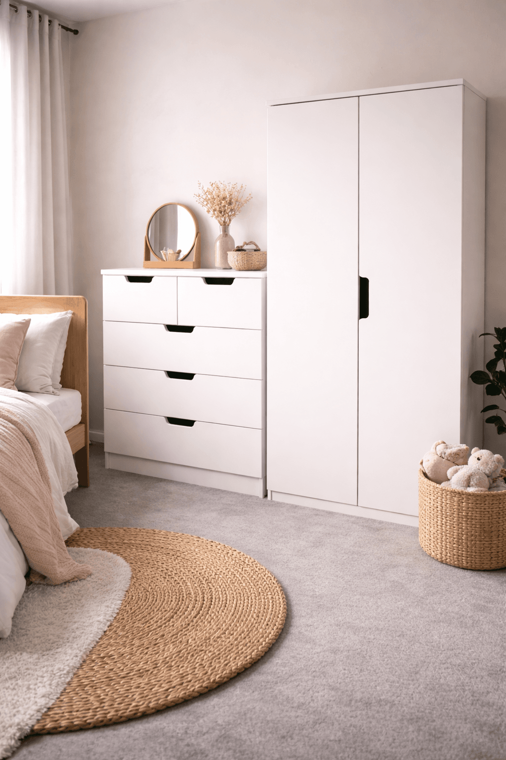 Inside the wardrobe, generous hanging space provides plenty of room for clothes, coats and everyday garments, making it ideal for both children’s bedrooms and adult spaces. The simple door design keeps everything hidden and organised while maintaining a tidy and uncluttered bedroom environment.