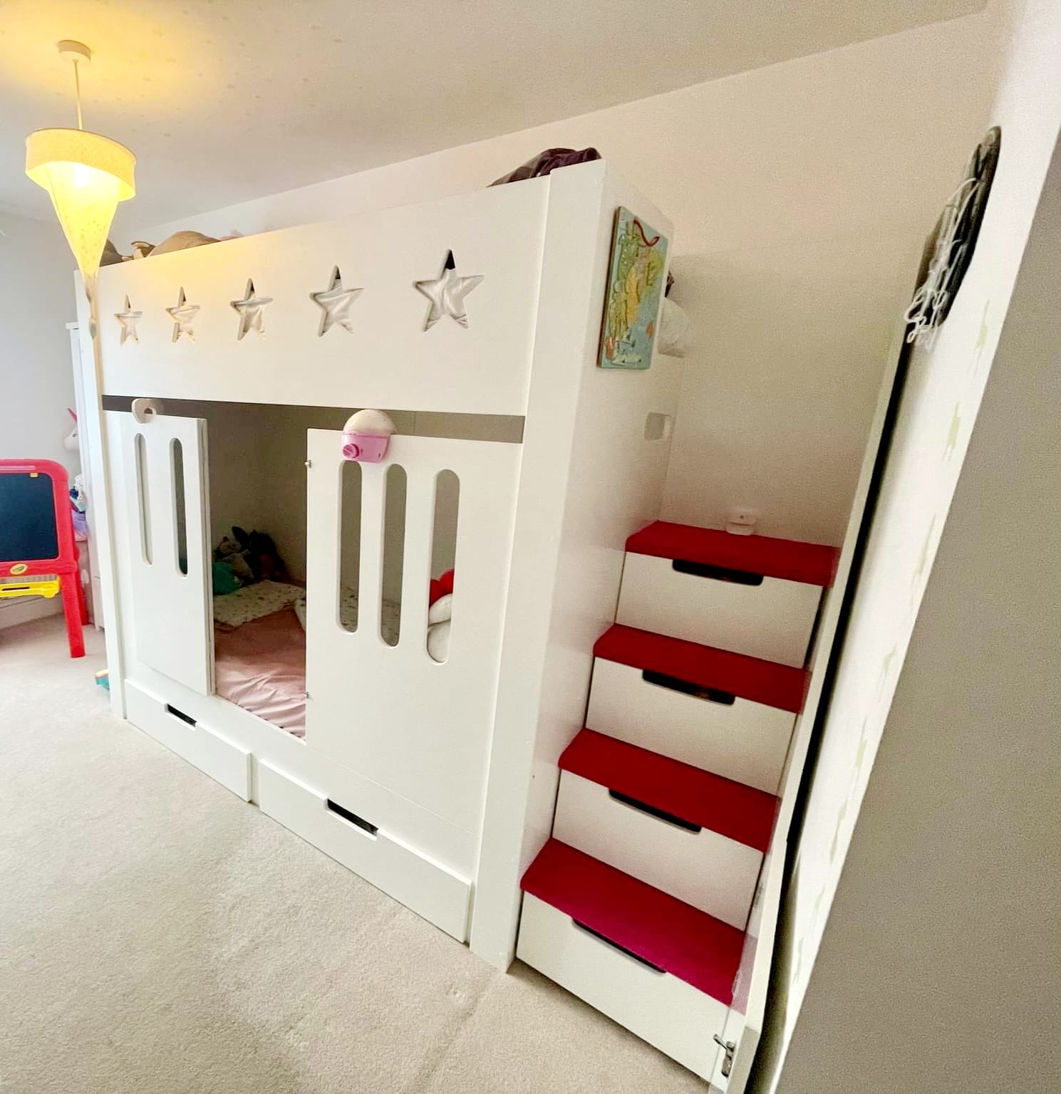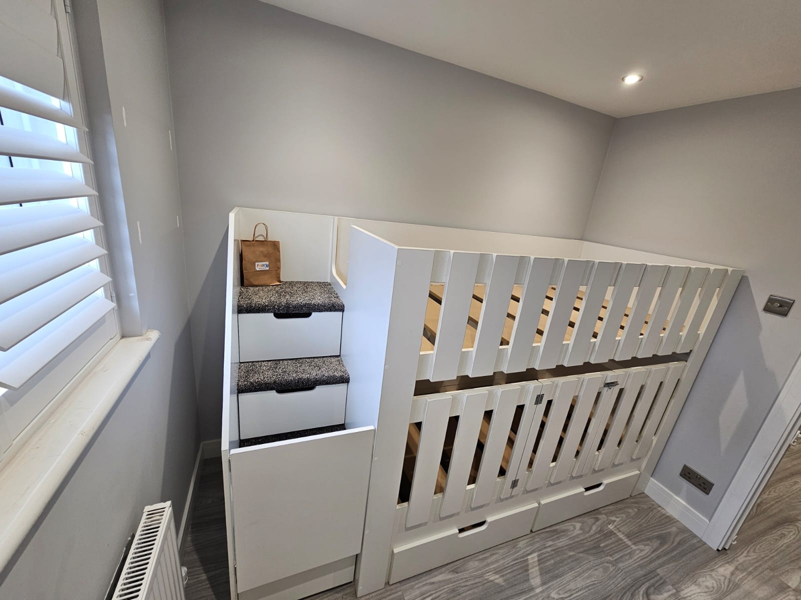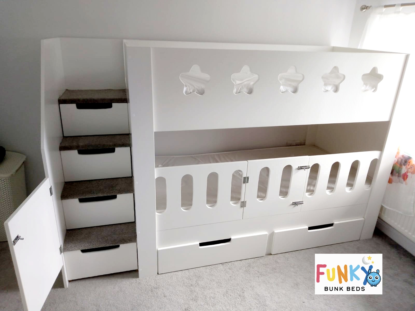 - We Can Make Adjustments To The Storage Cot Bunk To Fit The Space You Have Available. The Size Of The Stairs Or The Size Of The Mattress Can Be Altered (However This May Require A Bespoke Mattress) For Any Bespoke Requests Please Contact Us Via Facebook Or Email To Discuss.
