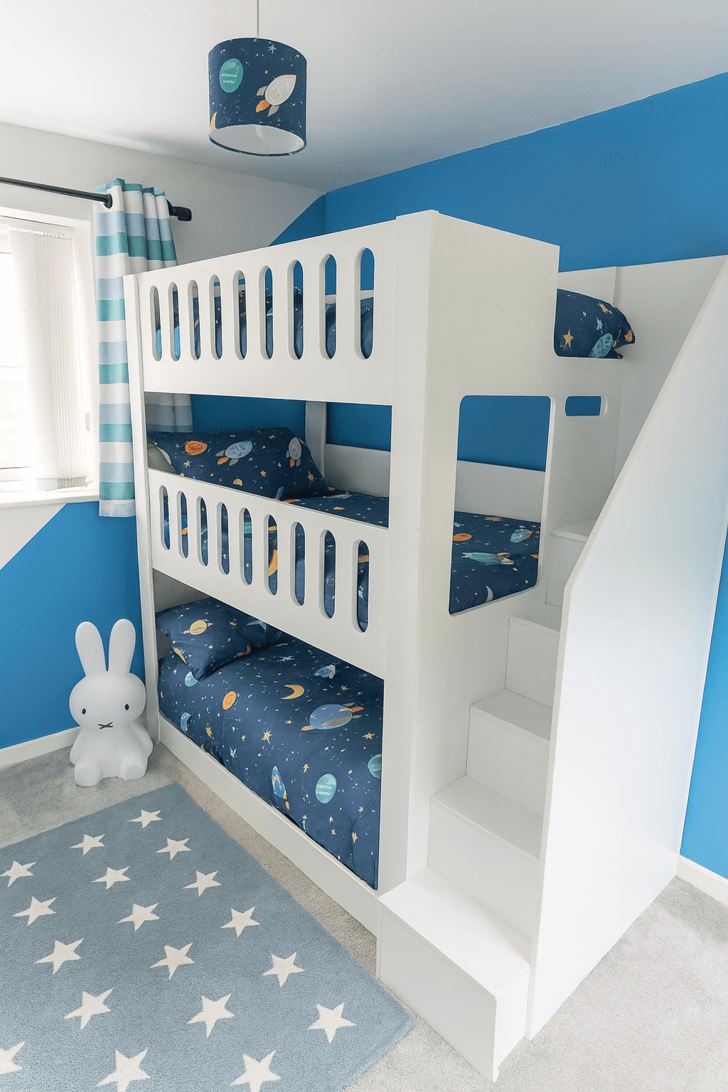 At Funky Bunk Beds, we design beds that are practical for everyday life. This triple bunk bed keeps the room feeling open and spacious while still providing three sleeping spaces. The stairs offer a comfortable step-by-step climb and also act as a stylish feature within the room.